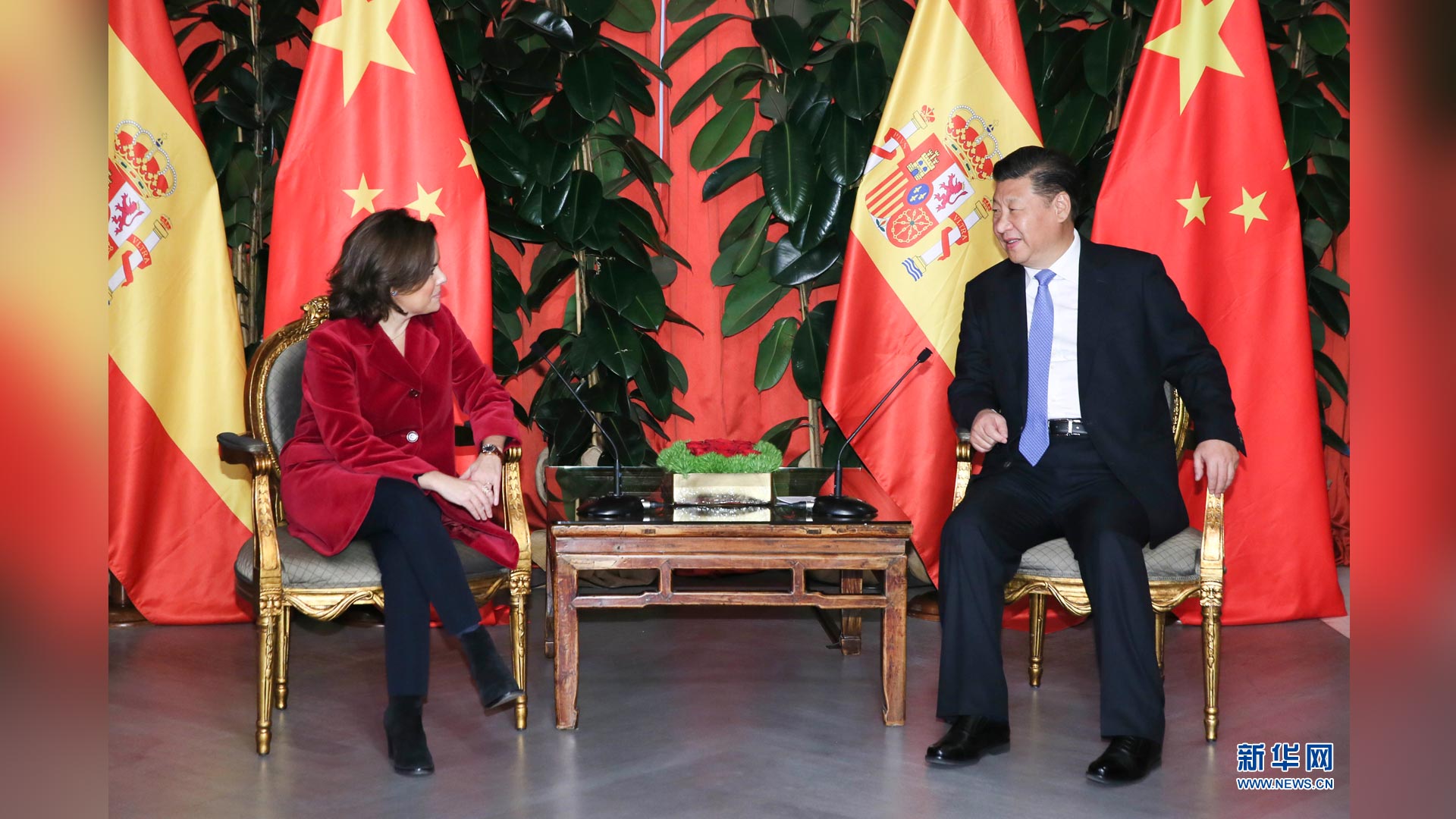11月24日,國家主席習近平在西班牙大加那利島會見西班牙副首相薩恩斯。 新華社記者 蘭紅光 攝2016-11-25
