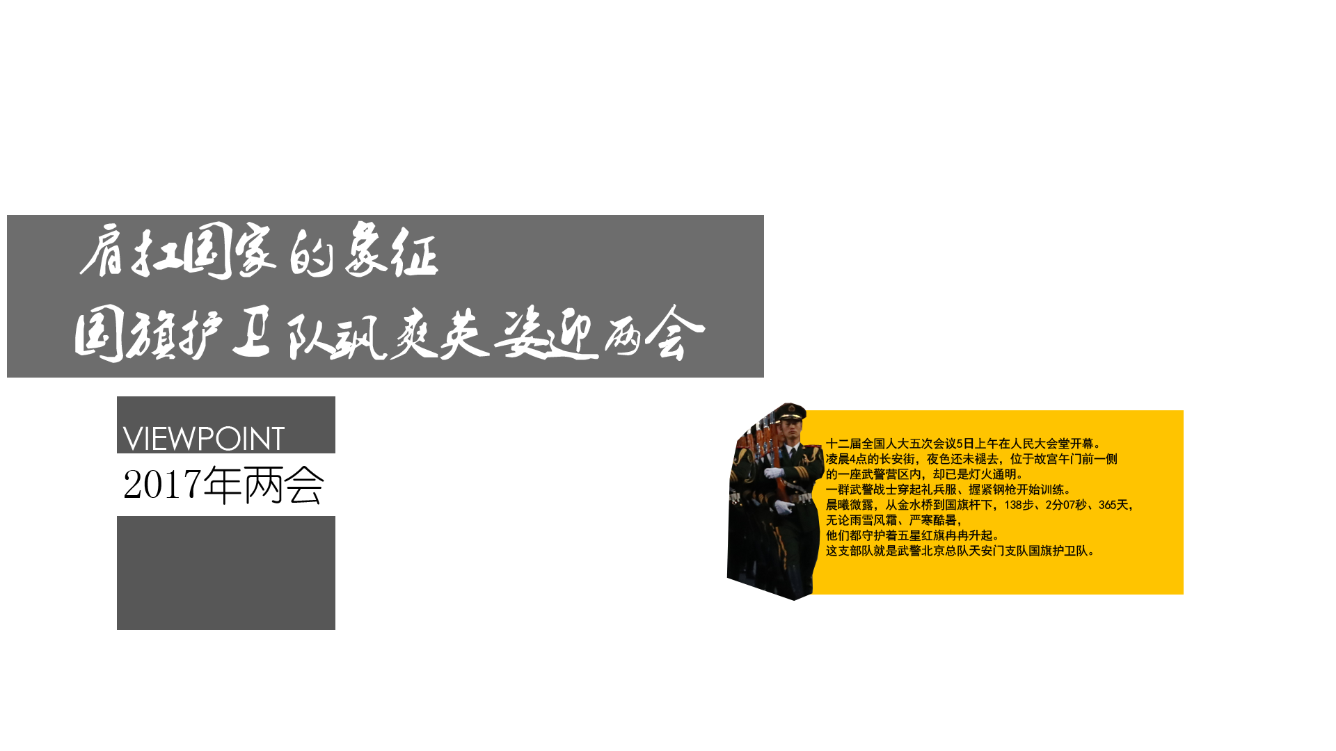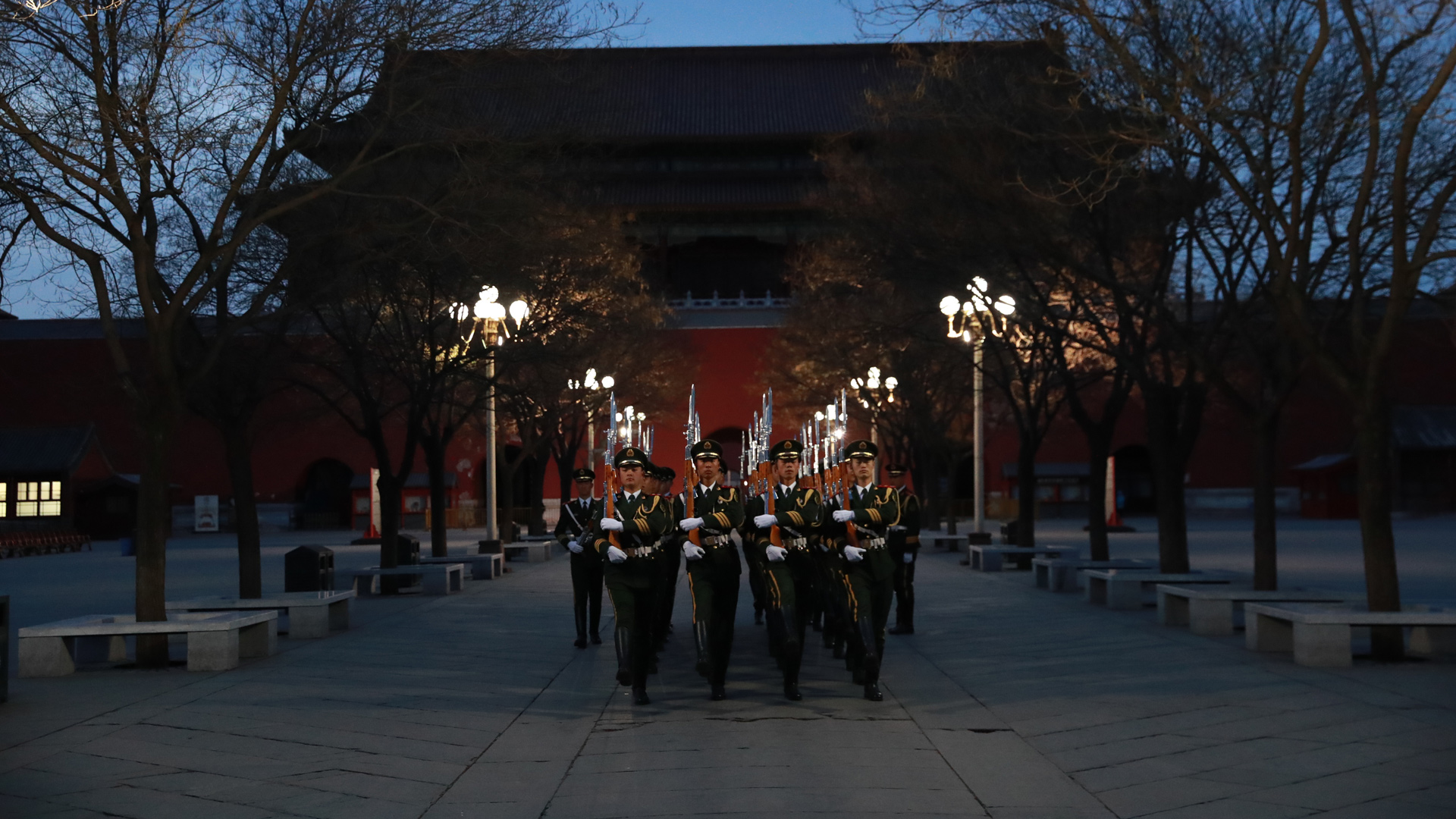2017年3月5日,第十二屆全國人民代表大會第五次會議在人民大會堂開幕。凌晨4點的長安街,夜色還未褪去,位于故宮午門前一側的一座武警營區(qū)內(nèi),卻已是燈火通明。一群武警戰(zhàn)士穿起禮兵服、握緊鋼槍開始訓練。晨曦微露,從金水橋到國旗桿下,138步、2分07秒、365天,無論雨雪風霜、嚴寒酷暑,他們都守護著五星紅旗冉冉升起。這支部隊就是武警北京總隊天安門支隊國旗護衛(wèi)隊。