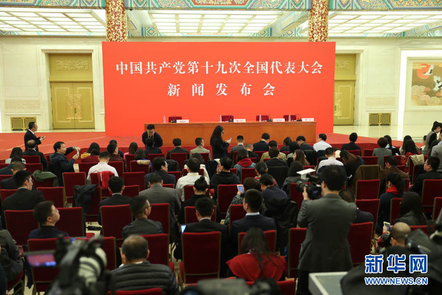 2017年10月17日下午,中國(guó)共產(chǎn)黨第十九次全國(guó)代表大會(huì)新聞發(fā)言人在人民大會(huì)堂三樓金色大廳舉行新聞發(fā)布會(huì),并回答中外記者提問(wèn)。圖為新聞發(fā)布會(huì)現(xiàn)場(chǎng)。新華網(wǎng) 翟子赫 攝
