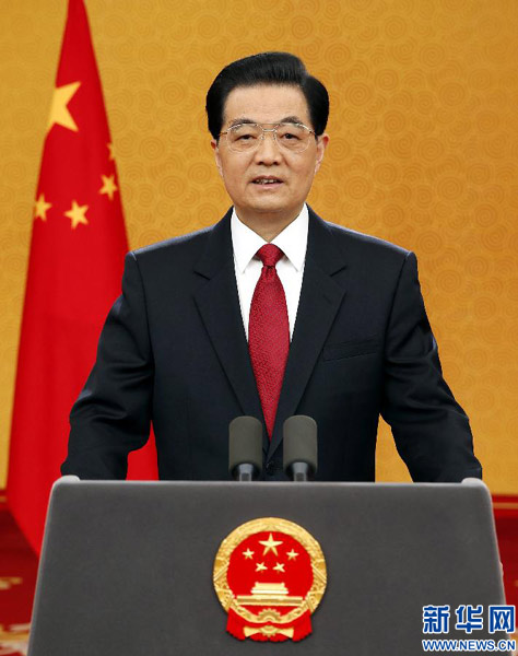 ????新年鐘聲就要敲響,2013年即將來臨。我很高興通過中國國際廣播電臺、中央人民廣播電臺和中央電視臺,向全國各族人民,向香港特別行政區同胞和澳門特別行政區同胞,向臺灣同胞和海外僑胞,向世界各國和各地區的朋友們,致以新年的祝福!