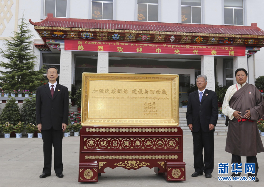 ??? 9月9日至10日,中央書記處書記、全國政協(xié)副主席、中央代表團副團長杜青林率林芝分團,帶著以習(xí)近平同志為總書記的黨中央對西藏各族人民的深切關(guān)懷和全國人民的美好祝福,看望慰問當(dāng)?shù)馗髯甯刹咳罕姟_@是9月10日,杜青林向林芝市贈送習(xí)近平總書記題詞“加強民族團結(jié) 建設(shè)美麗西藏”賀匾。 新華社記者丁林攝
