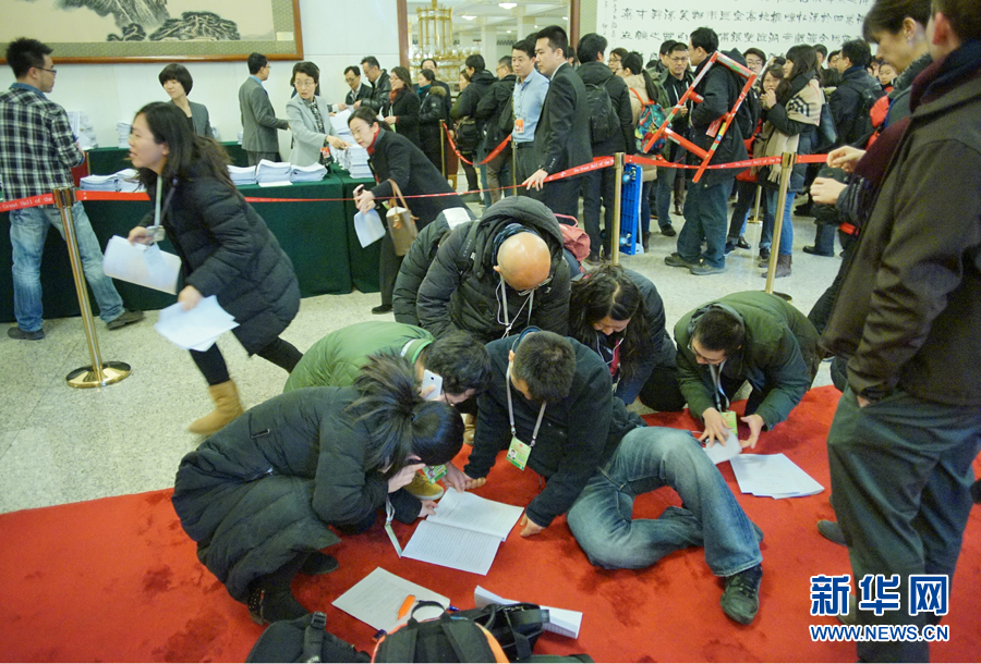 ??? 3月5日,第十二屆全國(guó)人民代表大會(huì)第三次會(huì)議在北京人民大會(huì)堂開(kāi)幕。這是記者在人民大會(huì)堂內(nèi)領(lǐng)到政府工作報(bào)告后抓緊閱讀。新華網(wǎng)/中國(guó)政府網(wǎng) 郭小天攝