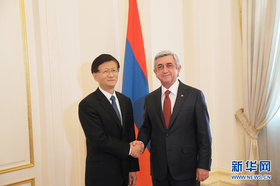 ?? ?5月21日,亞美尼亞總統薩爾基相在首都埃里溫會見到訪的習近平主席特使、中共中央政治局委員、中央政法委書記孟建柱。 新華社記者李銘攝