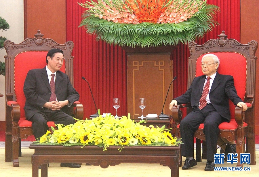 12月22日,越南共產黨中央總書記阮富仲(右)在河內會見率中共代表團出席第十二次中越兩黨理論研討會的中共中央政治局委員、中央書記處書記、中宣部部長劉奇葆。新華社記者樂艷娜攝