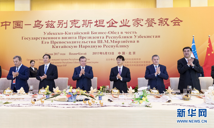 5月13日,中共中央政治局委員、中央政法委書記、中烏政府間合作委員會中方主席孟建柱在北京同烏茲別克斯坦總統米爾濟約耶夫共同出席中烏企業家餐敘會并致辭。新華社記者丁海濤 攝