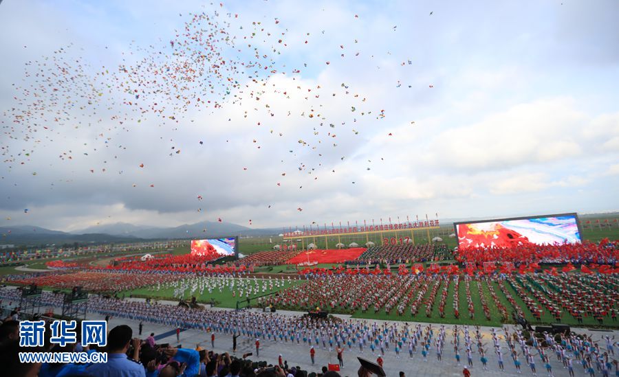 8月8日,內(nèi)蒙古自治區(qū)成立70周年慶祝大會在呼和塔拉內(nèi)蒙古少數(shù)民族群眾文化體育運動中心舉行。圖為群眾行進表演。新華網(wǎng)記者 陳杰 攝