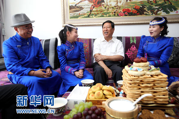 這是張平在蒙古族居民哈斯戈日樂(右一)家詳細詢問全家工作和生活情況。新華社記者 鄧華 攝