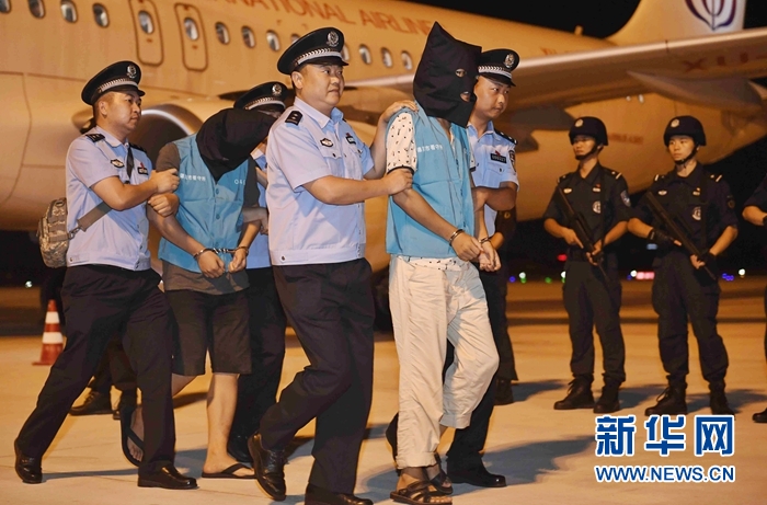 2017年8月24日,在成都雙流國(guó)際機(jī)場(chǎng),122名跨國(guó)電信詐騙案件犯罪嫌疑人從柬埔寨被統(tǒng)一押解回國(guó)。新華社記者 吳光于 攝