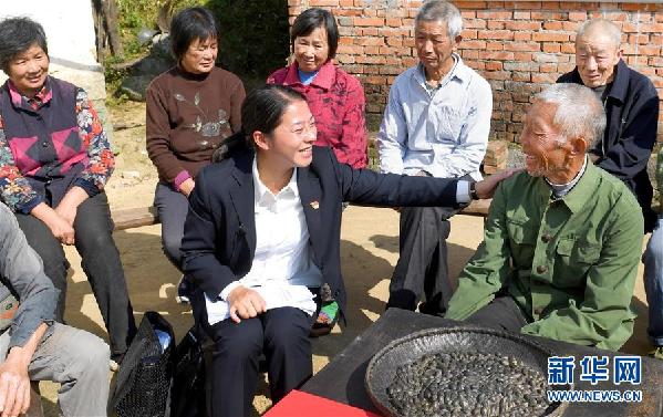 10月27日,十九大代表余靜(前左)在金寨縣大灣村與村民交流。新華社發(fā)(陳力攝)