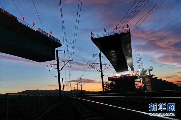 河北省懷來縣境內的新建京張高鐵跨大秦鐵路線土木特大橋連續(xù)梁在轉體中(9月17日攝)。新華社記者 楊世堯 攝