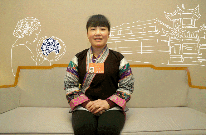 ??? ——全國人大代表蔡群在老家貴州畢節織金縣官寨鄉大寨村苗寨開了一家苗族蠟染刺繡公司,帶動寨子里300多名外出打工的婦女一起回鄉創業。
