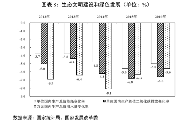 (七)加強生態(tài)環(huán)境保護和能源資源節(jié)約,綠色發(fā)展初見成效。單位國內(nèi)生產(chǎn)總值能耗和二氧化碳排放量分別下降5%和6.6%,超額完成全年目標,化學需氧量、氨氮、二氧化硫、氮氧化物排放量預計分別下降2.6%、2.9%、5.6%、4.0%,地級及以上城市空氣質(zhì)量優(yōu)良天數(shù)比例同比提高2.1個百分點,74個重點城市細顆粒物(PM2.5)年均濃度下降9.1%,地表水達到或好于Ⅲ類水體比例同比提高1.8個百分點、劣Ⅴ類水體比例同比下降1.1個百分點,萬元國內(nèi)生產(chǎn)總值用水量下降5.6%。