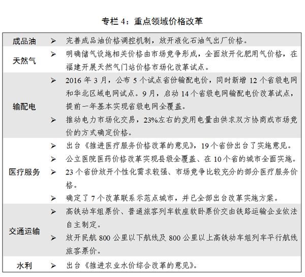 三是價格改革繼續(xù)深化。輸配電價改革試點實現(xiàn)所有省級電網(wǎng)全覆蓋。建立天然氣管道運輸定價新機制,占消費總量80%以上的非居民用氣門站價格主要由市場主導形成。石油天然氣交易市場加快發(fā)展。90%左右的城市已推廣居民階梯水電氣價。全面推進醫(yī)療服務價格改革。鐵路、民航旅客票價市場化程度明顯提高。農(nóng)業(yè)水價綜合改革穩(wěn)步推進。完善稻谷和小麥最低收購價政策,棉花、大豆目標價格改革試點深入推進。