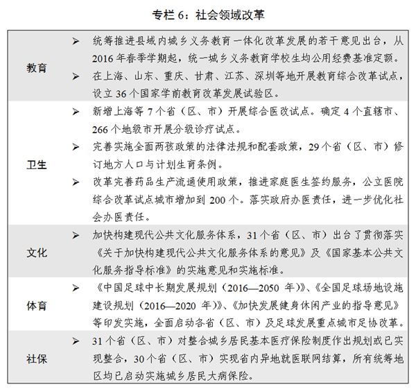 七是社會領域改革加快推進。中央和國家機關公務用車制度改革全面完成,地方黨政機關公車改革深入推進。行業(yè)協(xié)會商會與行政機關脫鉤改革第二批試點啟動實施。加快不動產(chǎn)統(tǒng)一登記制度落地,全國100%的地(市、州)、98%的縣(市、區(qū))實現(xiàn)“發(fā)新停舊”。國家科技計劃管理改革繼續(xù)深化,以增加知識價值為導向的分配政策出臺,科技成果轉(zhuǎn)化力度加大。教育領域綜合改革向縱深推進。分級診療制度建設持續(xù)推進,城鄉(xiāng)居民基本醫(yī)療保險制度整合取得實質(zhì)性進展,個人衛(wèi)生支出占衛(wèi)生總費用的比重下降到28.9%。《國務院辦公廳關于全面放開養(yǎng)老服務市場提升養(yǎng)老服務質(zhì)量的若干意見》(國辦發(fā)〔2016〕91號)印發(fā)實施。穩(wěn)步推進機關事業(yè)單位養(yǎng)老保險制度改革。加快構(gòu)建中國特色哲學社會科學,實施哲學社會科學創(chuàng)新工程。足球改革加快推進。