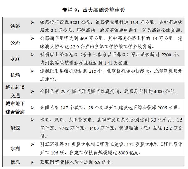 六是基礎設施網(wǎng)絡進一步完善。加快推進現(xiàn)代綜合交通運輸體系建設,交通基礎設施網(wǎng)絡總里程突破500萬公里。交通提質(zhì)增效、扶貧脫貧、重大基礎設施建設“一二三百”工程出臺實施,推進多式聯(lián)運發(fā)展,促進通用航空業(yè)發(fā)展,推動交通物流融合發(fā)展。能源生產(chǎn)和消費革命戰(zhàn)略出臺,能源供應能力不斷增強,非化石能源消費比重預計上升到13.3%,煤炭消費比重下降到62.0%。全國地級市基本建成光網(wǎng)城市,新一代信息基礎設施更加完善,建成全球最大的4G網(wǎng)絡。