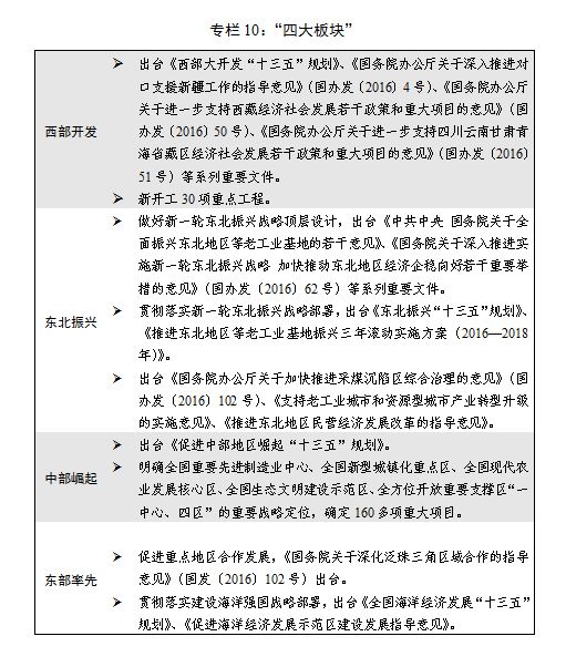二是區(qū)域發(fā)展總體戰(zhàn)略和差別化區(qū)域政策深入實施。加快新一輪西部大開發(fā),一批重大標志性工程開工建設,中西部地區(qū)經(jīng)濟繼續(xù)保持較快增長。出臺實施新一輪東北振興戰(zhàn)略和若干重大政策舉措,國企改革、投資營商環(huán)境改善等重點領域改革取得新進展。明確中部地區(qū)“一中心、四區(qū)”重要戰(zhàn)略定位,長江中游城市群重要增長極作用強化。東部地區(qū)轉(zhuǎn)型升級、開放創(chuàng)新、陸海統(tǒng)籌優(yōu)勢持續(xù)發(fā)揮,區(qū)域發(fā)展新動能新亮點不斷涌現(xiàn)。出臺促進區(qū)域協(xié)調(diào)發(fā)展的指導意見,差別化區(qū)域政策體系持續(xù)完善。國家綜合配套改革試驗區(qū)、國家級新區(qū)及各類開發(fā)區(qū)、承接產(chǎn)業(yè)轉(zhuǎn)移示范區(qū)、產(chǎn)城融合示范區(qū)、臨空經(jīng)濟示范區(qū)等重要功能平臺建設有序推進。加快革命老區(qū)、民族地區(qū)、邊疆地區(qū)和集中連片特困地區(qū)脫貧攻堅。完善支持政策措施,推進新疆、西藏、四省藏區(qū)經(jīng)濟社會發(fā)展和長治久安。