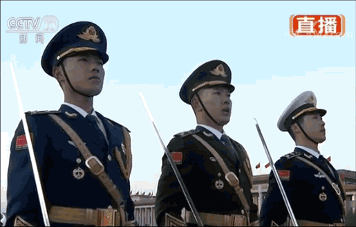 走在國旗手與護旗隊中間的分隊長,此次從一名增加到了三名,他們分別身著陸海空軍禮服,配掛指揮刀,代表解放軍全軍,負責發出升國旗口令。