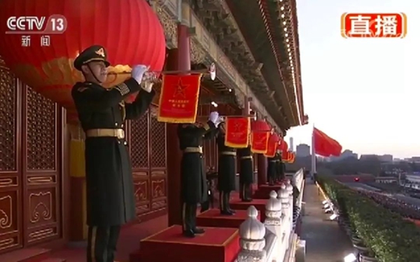 由軍樂團八名禮號手在天安門城樓演奏《升旗號角》音樂,增加了升旗儀式的神圣感與儀式感。八名禮號手經過嚴格挑選,從技術到體貌都是最優秀的,未來一年基本不會輪換。