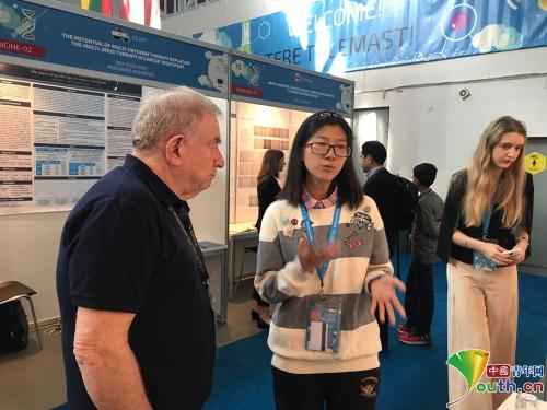 歐盟青少年科學家競賽中,賀婉卓正在向外國專家做講解。本人供圖