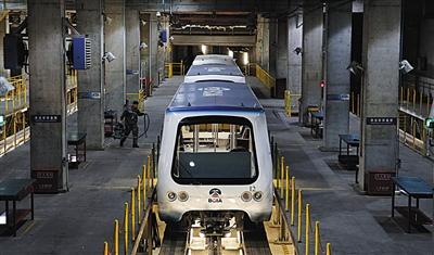 為了保證小火車安全運(yùn)行,在位于地下十六米的首都機(jī)場(chǎng)博維公司維修車間,原本三節(jié)一組的列車被拆分開,十余位工作人員正在對(duì)捷運(yùn)列車進(jìn)行例行檢修。隨著千斤頂?shù)木徛还?jié)車廂被抬升到離地一米的高度,兩名工作人員持手電對(duì)車底進(jìn)行檢修。工作人員介紹,在列車?yán)塾?jì)行駛達(dá)9600公里以上時(shí)都要進(jìn)行一次系統(tǒng)檢修。