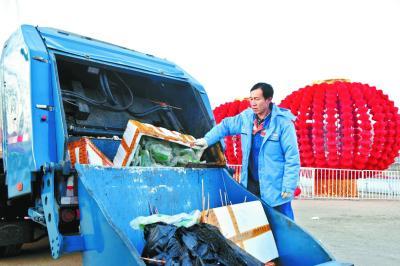 昨天,龍?zhí)洞汗?jié)文化廟會即將結(jié)束,李國棟將一堆堆的廟會垃圾裝進(jìn)垃圾車,這個春節(jié)的每一天他都是在這樣的勞作中度過的。 本報(bào)記者和冠欣攝