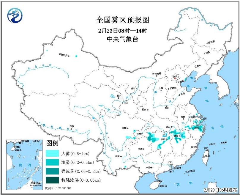 全國霧區(qū)預(yù)報(bào)圖(2月23日08時(shí)-14時(shí))