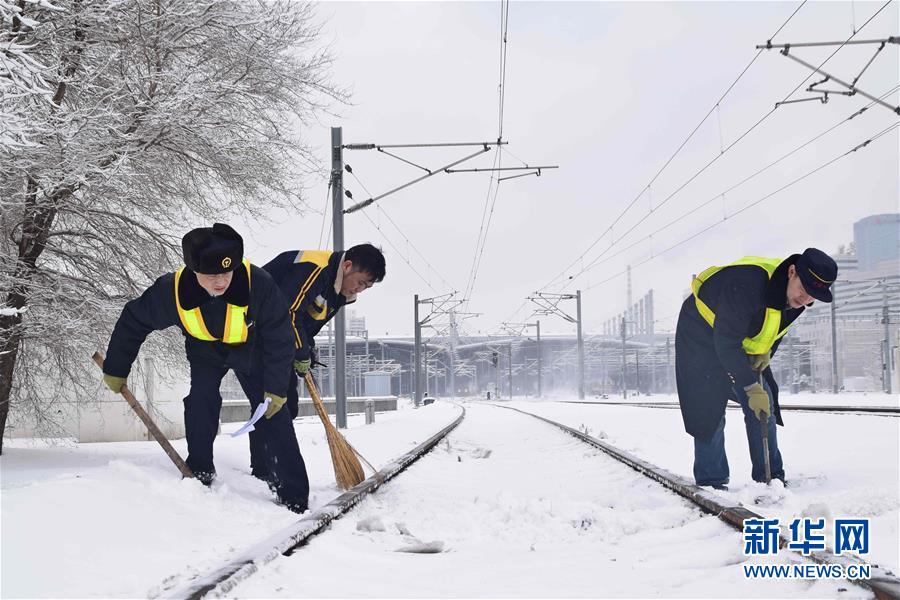 3月15日,沈陽北站的工作人員在清理鐵軌上的積雪。當日,沈陽降落春雪。新華社發(龍雷攝)