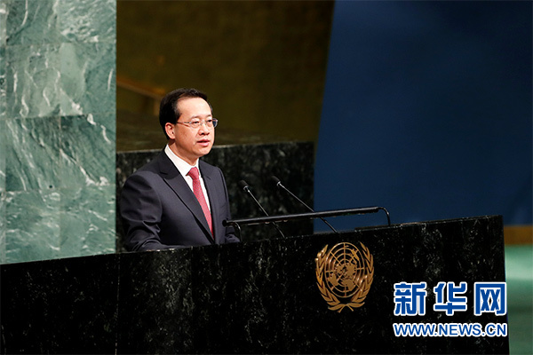 3月23日,在位于紐約的聯合國總部,中國常駐聯合國代表馬朝旭在聯合國大會“國際水行動十年”計劃高級別活動上發言,闡述中國水策略。新華社記者 李木子 攝