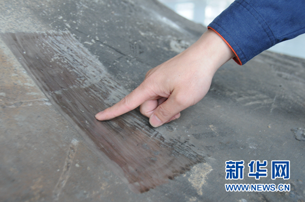 胡明華為記者展示用自動編程自適應機器人自動打磨系統(tǒng)打磨的鑄鍛件表面部分。新華網 聶晨靜 攝