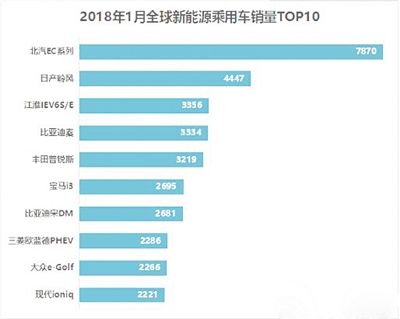 2018年1月全球新能源乘用車銷量超過8.2萬臺,其中中國新能源乘用車銷量達到了3.2萬臺,占比38.57%。從2018年1月全球新能源乘用車銷量排名來看,奪得冠軍的是自主品牌車型北汽EC系列,銷售了7870臺;排在第二位的是日產(chǎn)聆風,銷售了4447臺;緊隨其后的是江淮IEV6S/E,銷售了3356臺。除此之外,進入TOP10的自主品牌車型還有比亞迪秦和比亞迪宋DM。(來源:電動汽車資源網(wǎng))