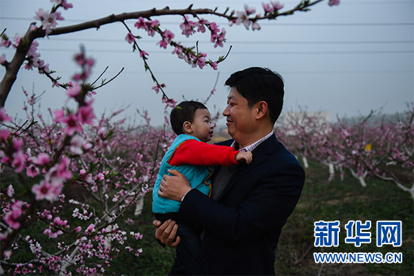 在泗陽縣南劉集鄉趙陳村“桃花源記”項目桃林前,市民帶著孩子賞花(3月31日攝)。新華社記者 季春鵬 攝