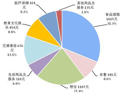 一季度,全國(guó)居民人均食品煙酒消費(fèi)支出1615元,增長(zhǎng)5.2%,占人均消費(fèi)支出的比重為31.3%;人均衣著消費(fèi)支出441元,增長(zhǎng)9.4%,占人均消費(fèi)支出的比重為8.6%;人均居住消費(fèi)支出1107元,增長(zhǎng)13.1%,占人均消費(fèi)支出的比重為21.4%;人均生活用品及服務(wù)消費(fèi)支出310元,增長(zhǎng)11.9%,占人均消費(fèi)支出的比重為6.0%;人均交通通信消費(fèi)支出676元,增長(zhǎng)4.9%,占人均消費(fèi)支出的比重為13.1%;人均教育文化娛樂(lè)消費(fèi)支出454元,下降5.4%,占人均消費(fèi)支出的比重為8.8%;人均醫(yī)療保健消費(fèi)支出424元,增長(zhǎng)20.7%,占人均消費(fèi)支出的比重為8.2%;人均其他用品及服務(wù)消費(fèi)支出135元,增長(zhǎng)6.3%,占人均消費(fèi)支出的比重為2.6%。