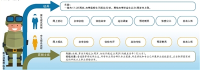 男青年應(yīng)征需經(jīng)過網(wǎng)上登記、初審初檢、體檢政審、走訪調(diào)查、預(yù)定新兵、張榜公示、批準入伍7個環(huán)節(jié)。