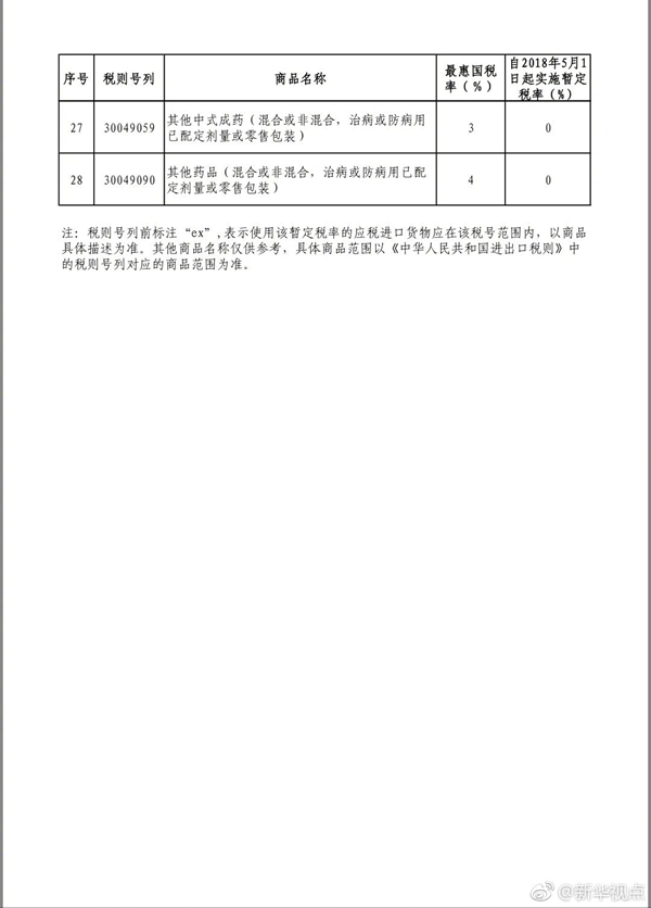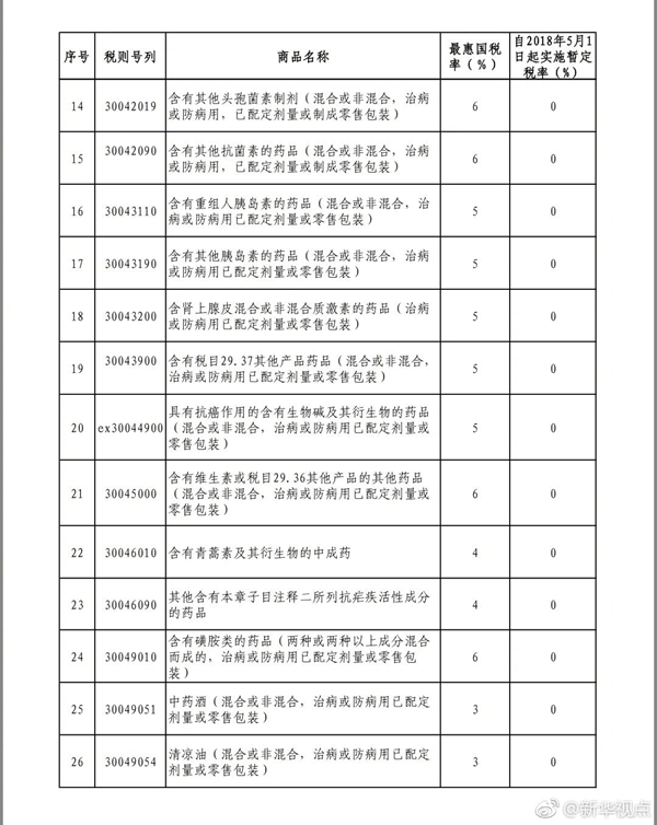 新華網(wǎng)北京4月23日電 財政部關稅司23日發(fā)布消息,5月1日起我國將取消包括抗癌藥在內(nèi)的28項藥品進口關稅。調整后,除安宮牛黃丸等我國特產(chǎn)藥品、部分生物堿類藥品等少數(shù)品種外,絕大多數(shù)進口藥品,特別是有實際進口的抗癌藥均將實現(xiàn)零關稅。(記者郁瓊源) ????(據(jù)新華社“新華視點”微博報道)?