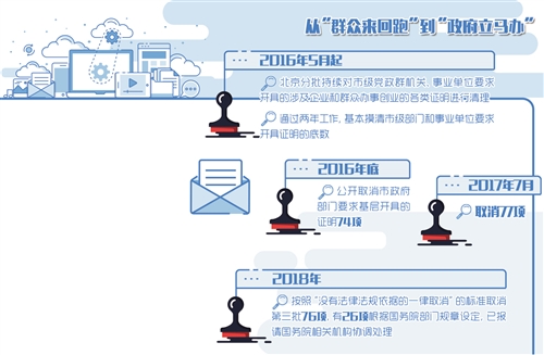 從2016年5月份起,北京市分批持續清理市級黨政群機關、事業單位要求開具涉及企業和群眾辦事創業的各類證明。通過兩年工作,基本摸清市級部門和事業單位要求開具證明的底數。2016年底,公開取消市政府部門要求基層開具的證明74項;2017年7月份取消77項;今年則按照“沒有法律法規依據的一律取消”的標準取消第三批76項。今年取消的76項證明中,有26項根據國務院部門規章設定,已報請國務院相關機構協調處理。