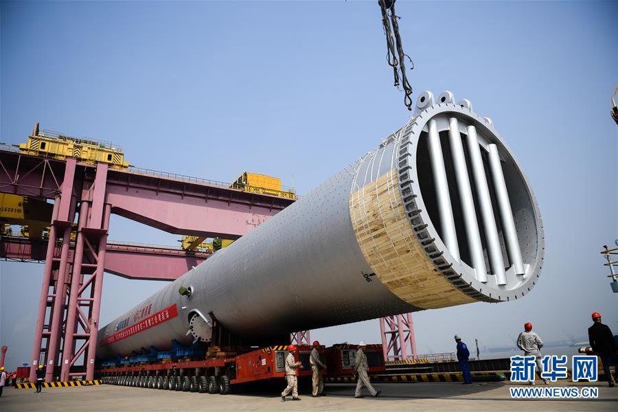 4月28日,江蘇鎮江,工人在給260萬噸/年沸騰床渣油鍛焊加氫反應器做發運前的準備工作。新華社記者李響 攝