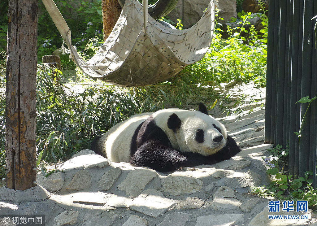 5月2日,在動物園內,熊貓曬著太陽,時不時伸個懶腰,翻個身,笨拙的動作盡顯萌態。(圖片來源:視覺中國)