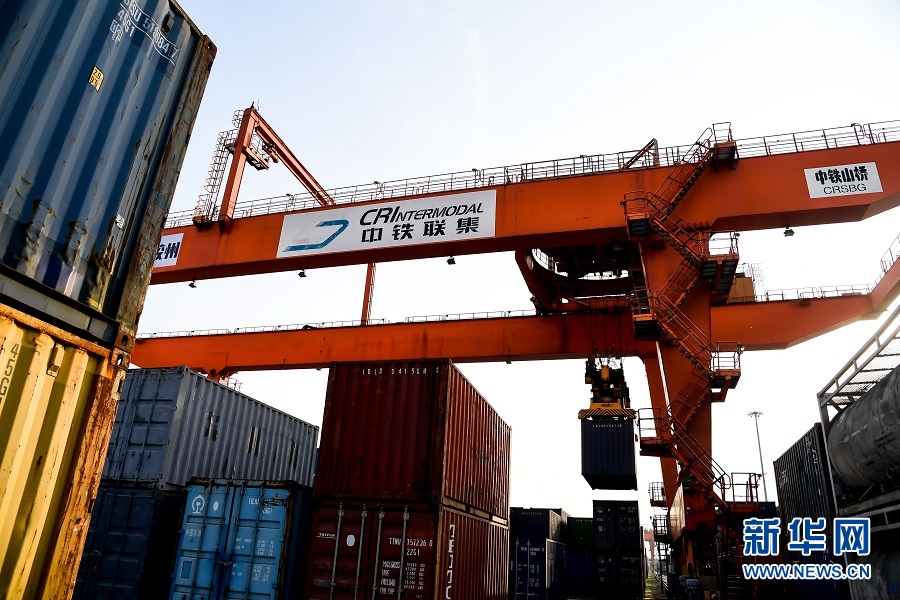 占地1800畝的中鐵聯(lián)集青島中心站內(nèi),藍(lán)色、白色的集裝箱把場(chǎng)站裝點(diǎn)成一片“集裝箱海洋”;橫穿場(chǎng)站的兩條鐵軌旁,數(shù)座巨型龍門吊繁忙作業(yè),來(lái)自海上的貨物被搬運(yùn)至將遠(yuǎn)行的國(guó)際班列上……