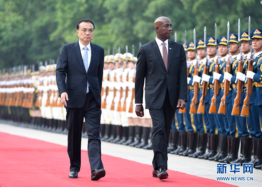 5月14日,國務院總理李克強在北京人民大會堂同來華進行正式訪問的特立尼達和多巴哥總理羅利舉行會談。會談前,李克強在人民大會堂東門外廣場為羅利舉行歡迎儀式。新華社記者 燕雁 攝