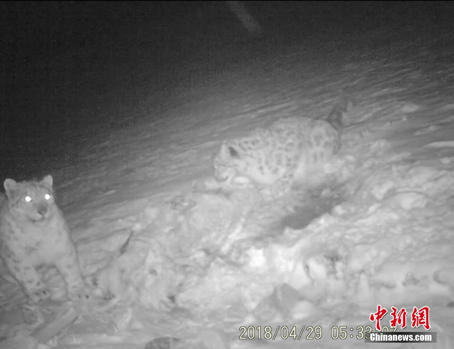 兩只成年雪豹分食一頭獵物。文/趙朗 曾嘉 監測畫面