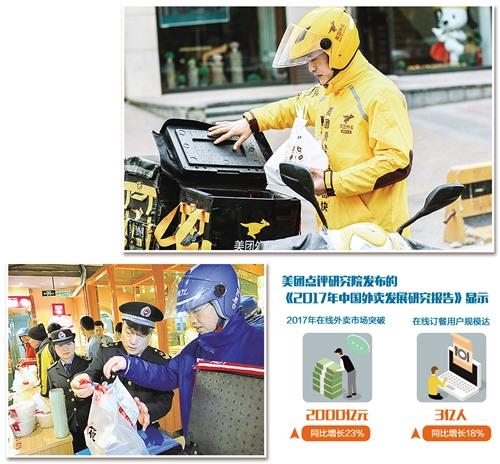 快節奏的都市生活、迅捷的網絡支付和日益發達的配送網絡,催生了以“美團外賣”“百度外賣”“餓了么”等為代表的網絡餐飲服務平臺。美團點評研究院發布的《2017年中國外賣發展研究報告》顯示,2017年在線外賣市場突破2000億元,同比增長23%;在線訂餐用戶規模達3億人,同比增長18%。
