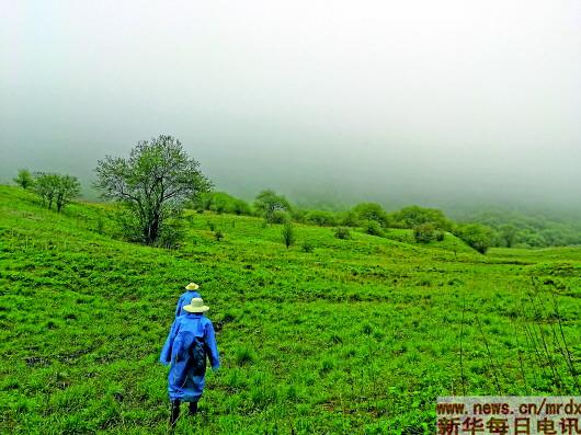 記者依依不舍地告別珙桐,又攀行一小時許,終于抵達海拔2200米左右的山頂“黃竹埡”。登高遠眺,山的另一側呈現出截然不同的景象:一望無際的草叢鋪就連綿起伏的綠毯,散落的樹林在雨霧中勾勒出神秘而美麗的輪廓。