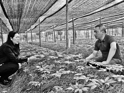科研人員在文山苗鄉三七種植基地查看三七種苗。本報記者 張勇攝/光明圖片