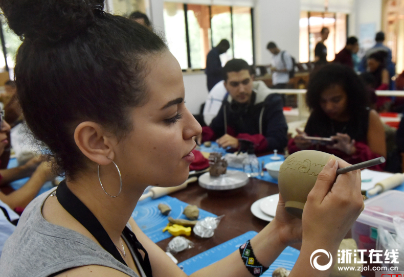2018年6月3日,來自摩洛哥的留學生伊可(Oughalmi ikram),在自己親手做的作品上刻國籍、姓名,以留作紀念。