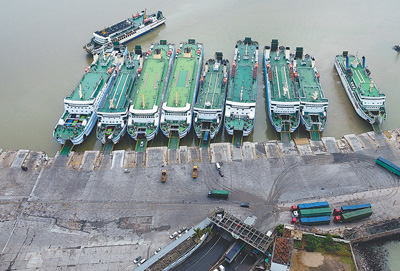 7日,廣東徐聞縣海安港碼頭,正在裝載客貨車的客滾船。新華社記者 楊冠宇 攝