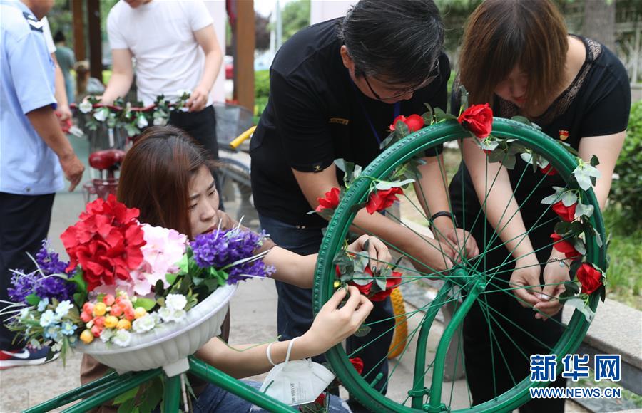 6月9日,豐臺區花鄉天倫錦城社區居民們在裝飾廢舊自行車。