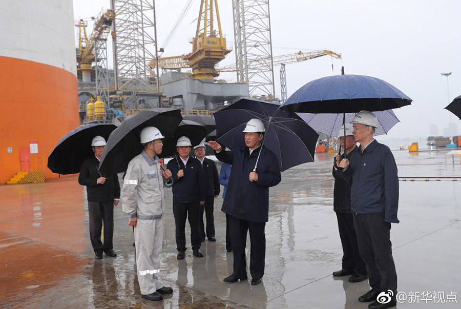 6月13日下午,習近平冒雨來到中集來福士海洋工程有限公司煙臺基地。“藍鯨1號”鉆井平臺巍峨佇立、“泰山”龍門吊高聳入云,習近平撐著傘邊走邊看,詳細了解企業走自主創新發展之路、開展高端海洋工程設備自主設計研發制造情況。聽說“藍鯨1號”去年創造了可燃冰開采時間和產量兩項世界紀錄,習近平鼓勵他們繼續努力。總書記同現場的工人們一一握手,他說,基礎的、核心的東西是討不來買不來的,要靠我們自力更生、自主創新來實現。我看你們有這個信心,希望你們迎難而上、再接再厲。(記者張曉松、謝環馳)(點擊觀看視頻)