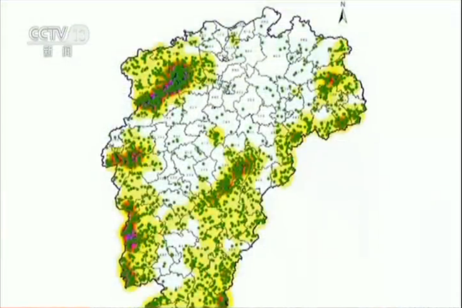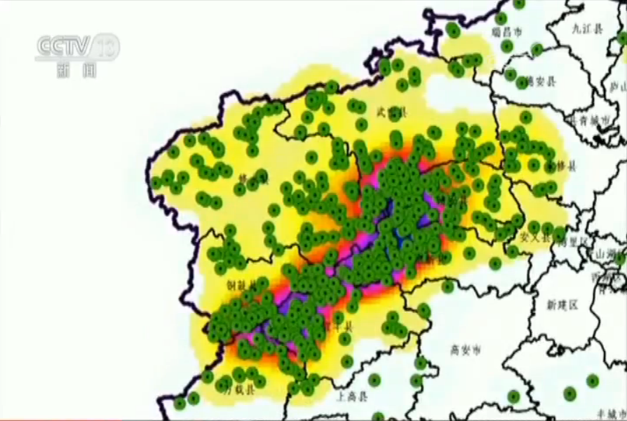 樂洞河支流眾多,幾乎有落差的支流都建上了小水電。而記者將掌握的資料進行特殊處理,在江西省地圖上標出所有小水電站的位置,這些密密麻麻的小綠點便鋪滿了整張地圖,在水資源豐沛處,綠點甚至連成一片。