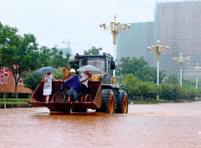 7月6日,江西省撫州市東鄉(xiāng)區(qū)部分道路積水嚴重,市民乘坐鏟車通過積水路段 何江華攝