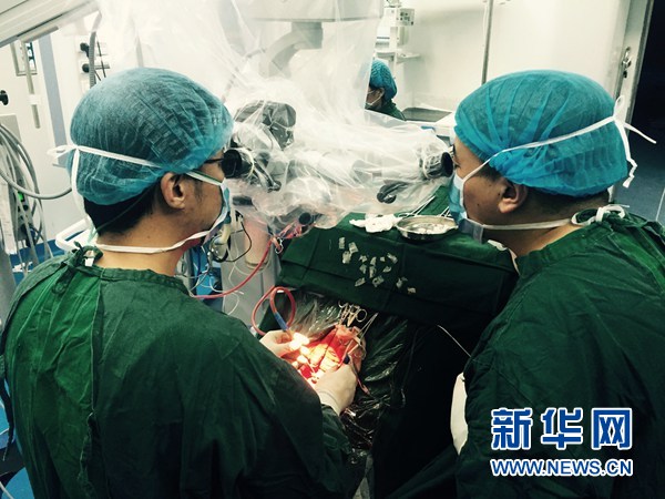 援藏醫(yī)生與那曲本地醫(yī)生在合作進行手術(shù)(2017年11月24日攝)。 新華社發(fā)